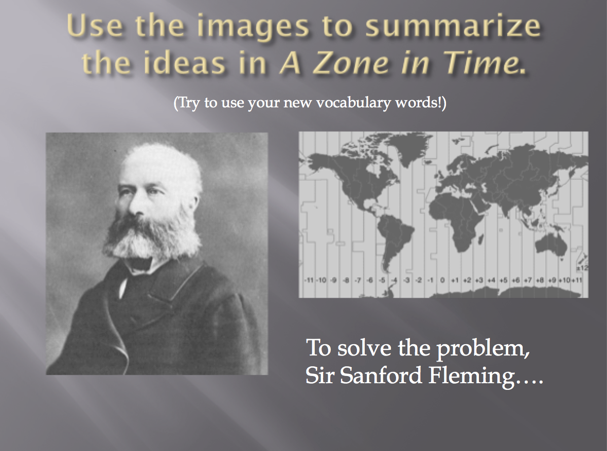 Last week, I used this strategy after my students completed a reading on the history of time zones from the textbook From Reading to Writing 4 (Pearson). Here are a few of the slides I used, with notes on the kinds of sentences my students produced.