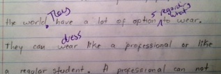 • The students write in their blue books and submit them during the next class. The teacher reads them and corrects the grammar only. (This takes a surprisingly short time since the teacher does not need to address content and organization.)