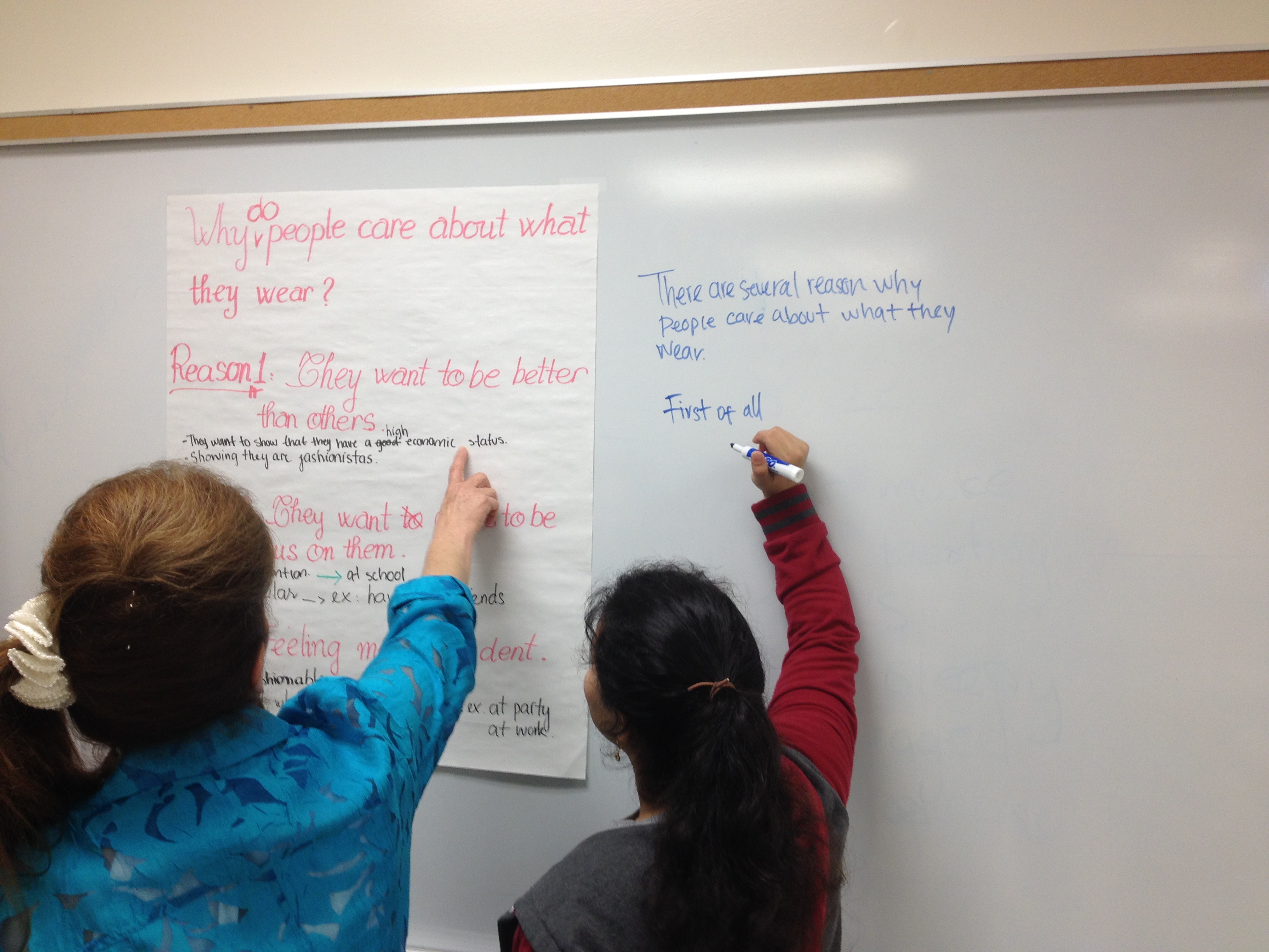 IMG_2867IMG_2876As students put up their reasons and moved to other stations to add the details, they were actively engaged in trying to understand the original group’s intentions and support their points.   Sometimes they debated about whether the main reasons or effects made sense or not. Some decided to improve upon the original group’s major points, altering them so they were clearer.   When students wrote the thesis and topic sentences at the third station, they also negotiated the language they needed to use to present each point.