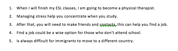 - Put the students into pairs. Before you give them the sentences, tell them that there is one error in each sentence, and their job is to find and correct it. When they think they are finished with all five, they should raise their hand.